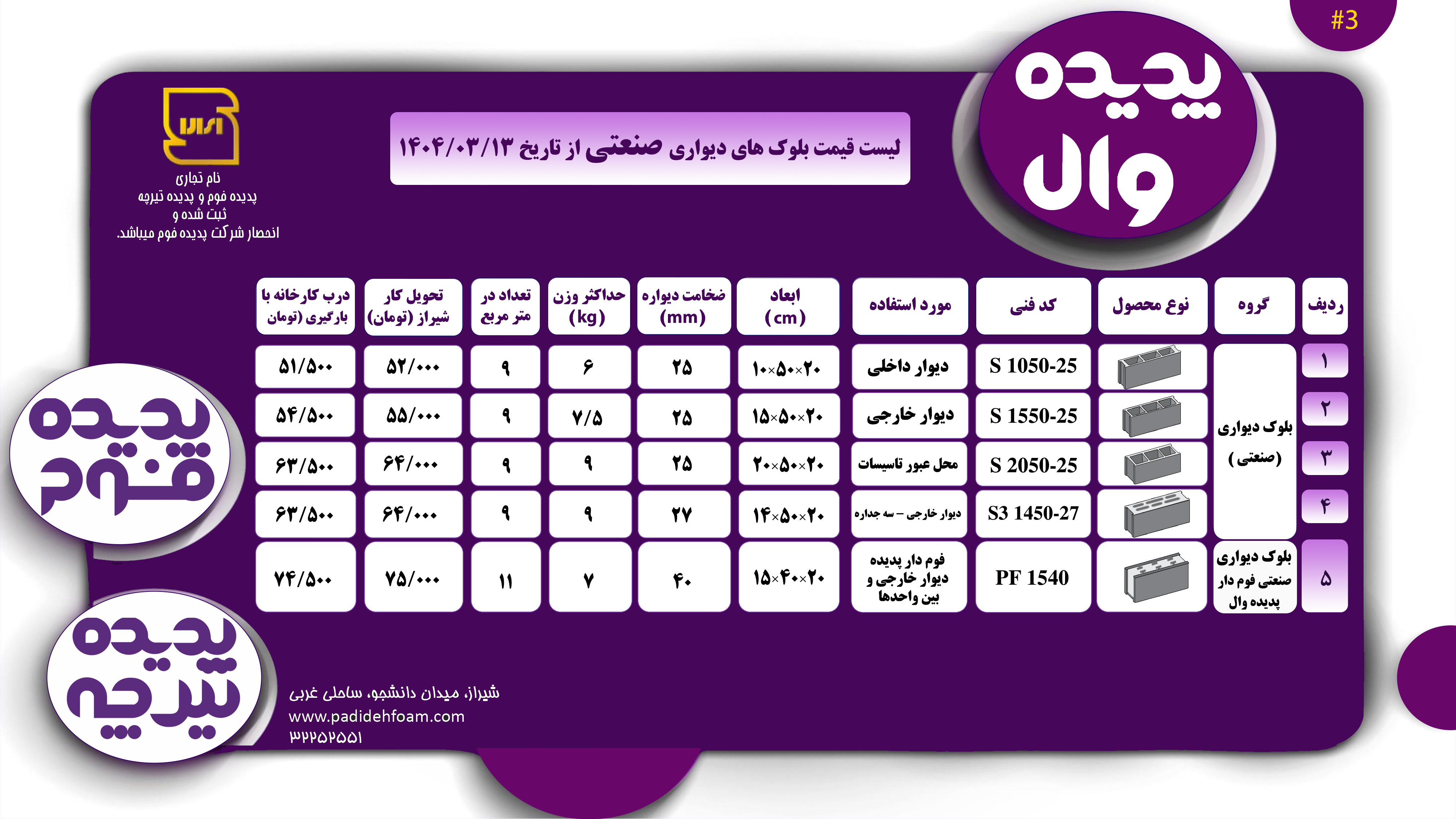 شرکت پدیده فوم با هدف بلندمدت افزایش سطح کیفیت در زمینه مصالح ساختمانی و هدف اولیه تولید بلوک های سقفی پلی استایرن در راستای ارتقاء صنعت استان فارس در سال 81 در شیراز به ثبت رسید. فاز اول تولیدات شرکت به عنوان اولین دریافت کننده پروانه بهره برداری تولید بلوک پلی استایرن در استان فارس، شامل انواع بلوکهای سقفی و ورق های پلی استایرن غیر قابل اشتعال بوده و د رسال 1383 وارد بازار گردید. خوشبختانه با برنامه ریزی های انجام شده فاز دوم کارخانه در پایان سال 1385 با ظرفیت تولید 1700 تن بلوک پلی استایرن که حدود یک میلیون متر مربع بلوک سقفی استاندارد می باشد راه اندازی و افتتاح گردید که علاوه بر استان فارس به استان های خوزستان ، بوشهر ، کهکیلویه و بویراحمد و هرمزگان ارسال می گردد.فاز سوم تولیدات که شامل انواع بلوک های سبک دانه سرپر می باشد با هدف بهینه سازی ، سبک سازی و افزایش سرعت اجرا در دیوارهای آپارتمانی بعد از فعالیت بر روی سقف در آخر سال 1393 راه اندازی و به بازار عرضه گردید. فاز چهارم تولیدات شامل انواع تیرچه های بتنی استاندارد بوده که در سال 1400 در محل جدید شرکت با نام پدیده تیرچه که زیر مجموعه ای از گروه تولیدی پدیده فوم میباشد راه اندازی گردید